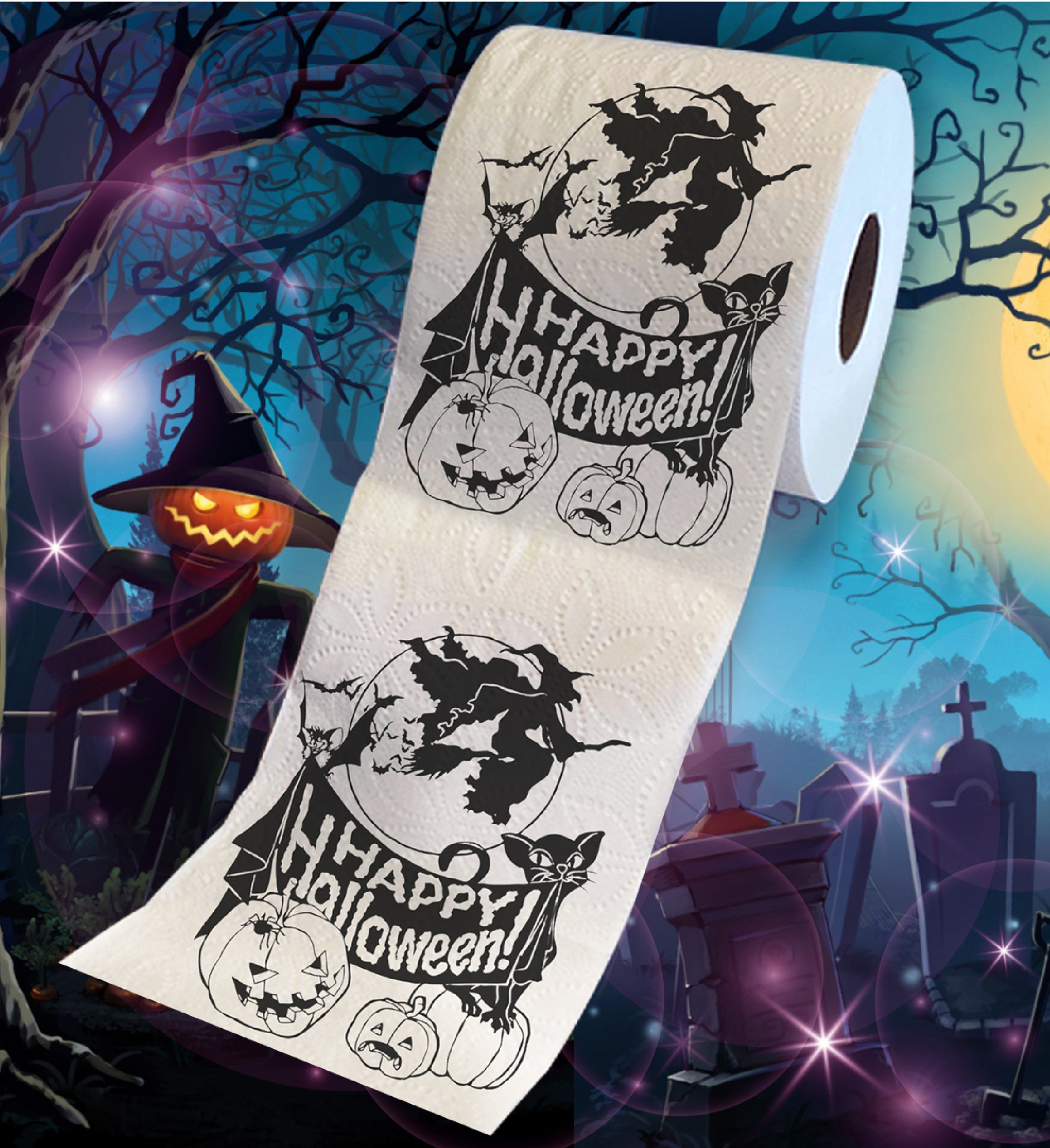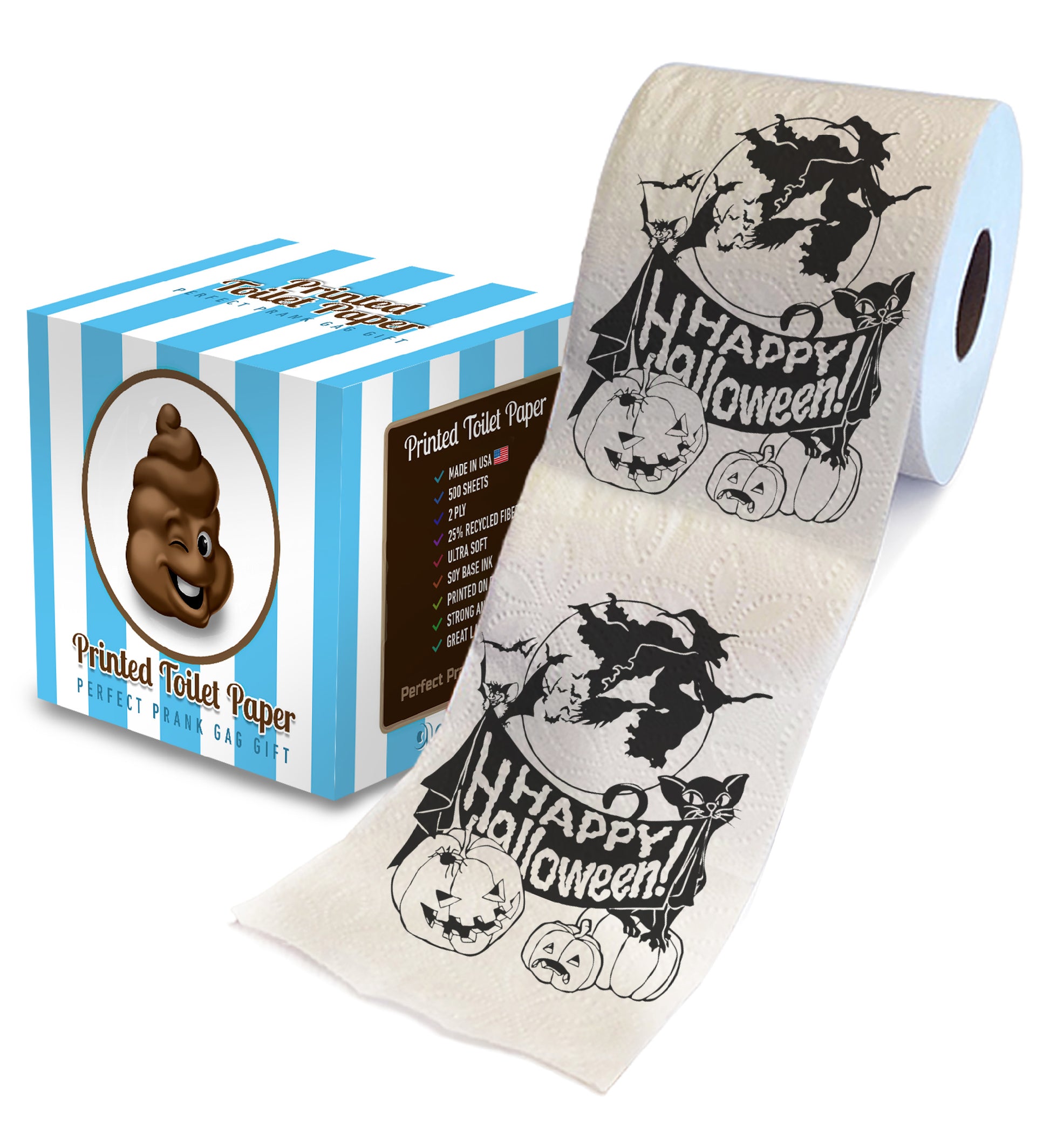 - THE HALLOWEEN THEME NOVELTY TOILET PAPER IS FOR THOSE WHO LOVE SPOOKY FUNNY STUFF – The Happy Halloween toilet paper roll is a scary toilet paper for a prankster to gift coworkers, friends, family, men and women! Happy Halloween decor to give away as funny adult gag gifts, party giveaway, or office gift. Spook your guests, friends or coworkers so they will have a roll while in the bathroom. Perfect to add to Halloween spooky baskets!
