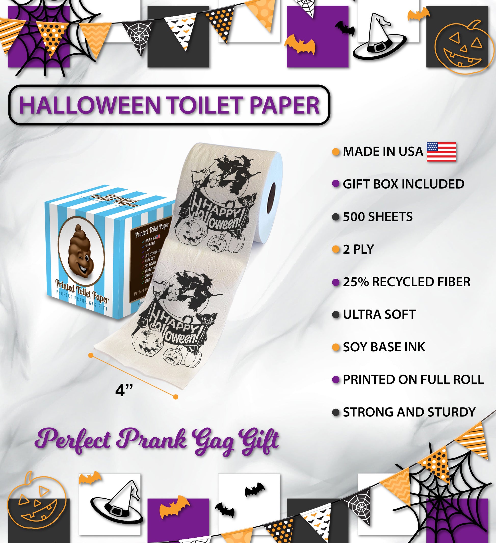 - INCLUDED WITH THE PURCHASE OF THE HAPPY HALLOWEEN TOILET PAPER – Includes 1 full size 2 ply 500 printed sheets toilet paper roll with a cute gift box! Not just a surprise gag gift idea, you can use it for party supplies decorations, bath decor, streamers, and party favors. Need a laugh at the office, add the toilet roll and catch all of your team's hilarious spooked reactions. Size 4x4 inches.