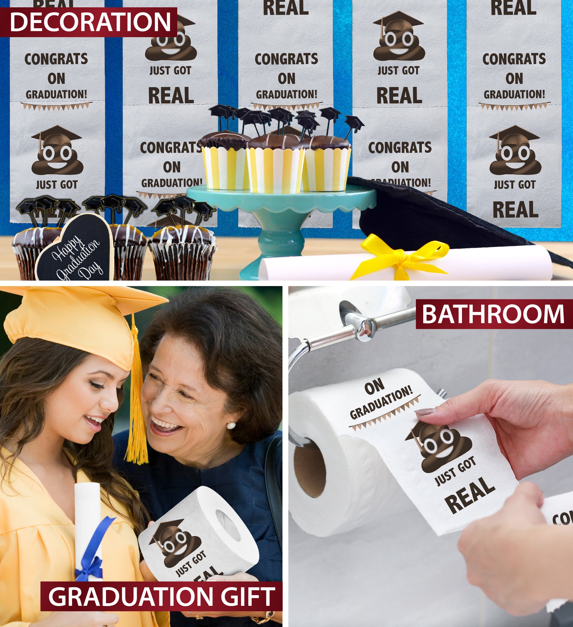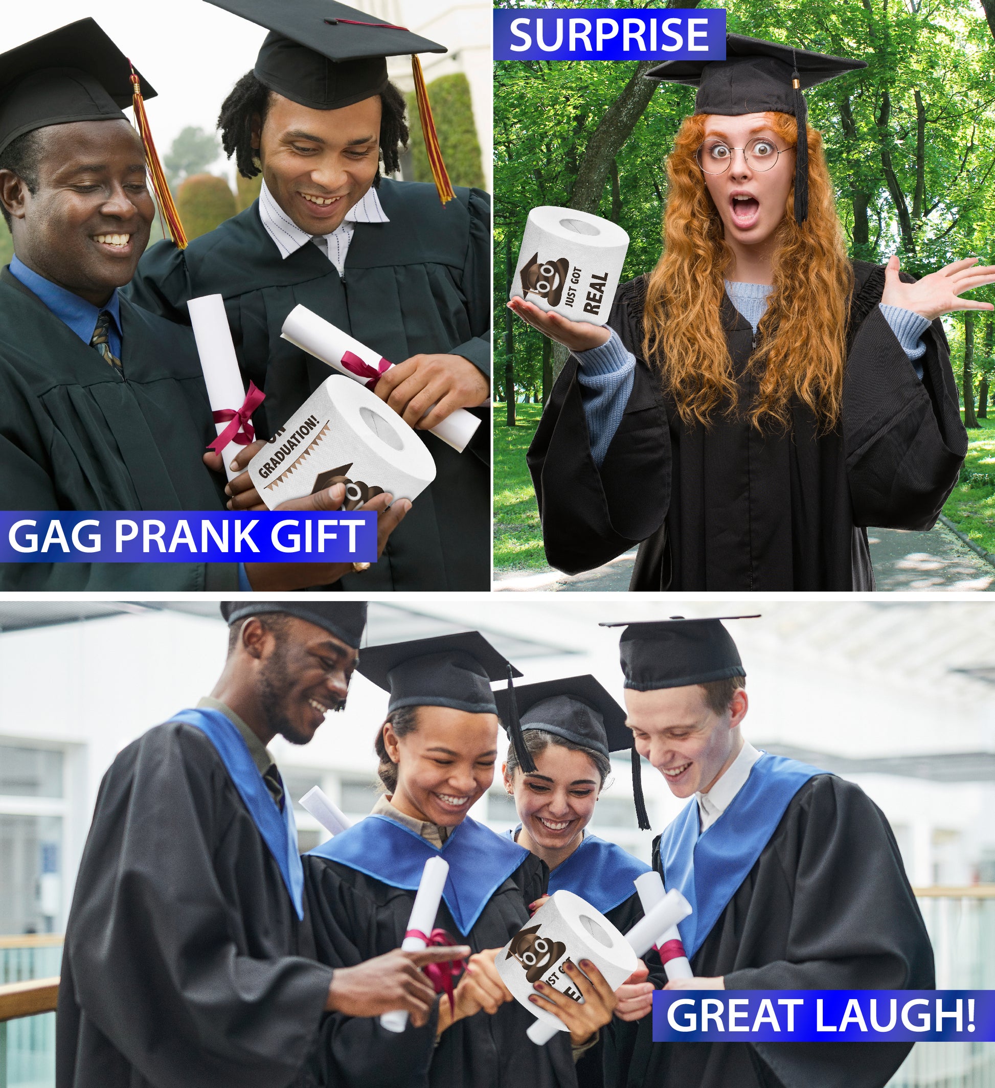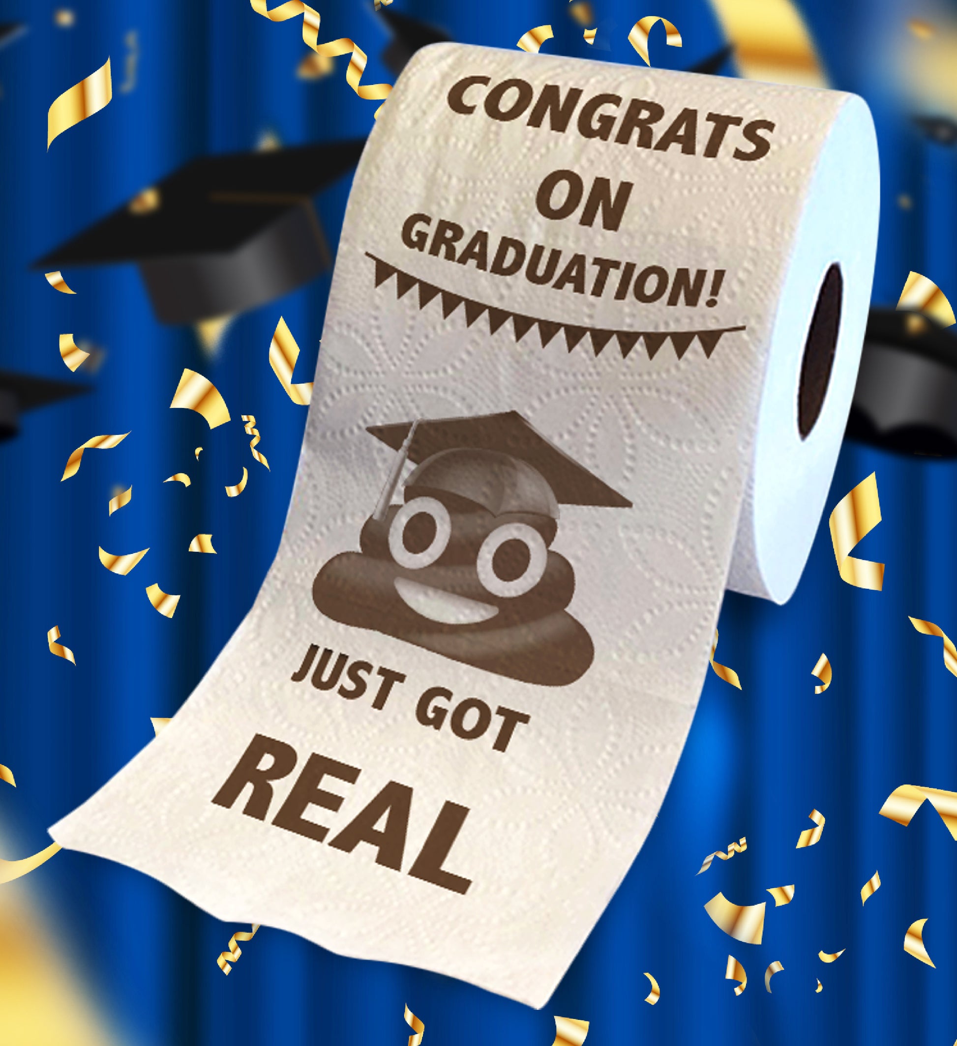 IDEAL USE FOR THE PRINTED TOILET PAPER FUNNY GRADUATION GIFT - Graduates will be delighted with the Congrats On Graduation Sh*t Just Got Real toilet paper! Surprise your graduating classmates, friends and family with this fun toilet paper prank gift, No need for wrapping! It is packaged in a colorful gift box. Cool novelty add on to any graduation gift box or gift bag stuffers for him or her. Enjoy a last laugh with your classmates!