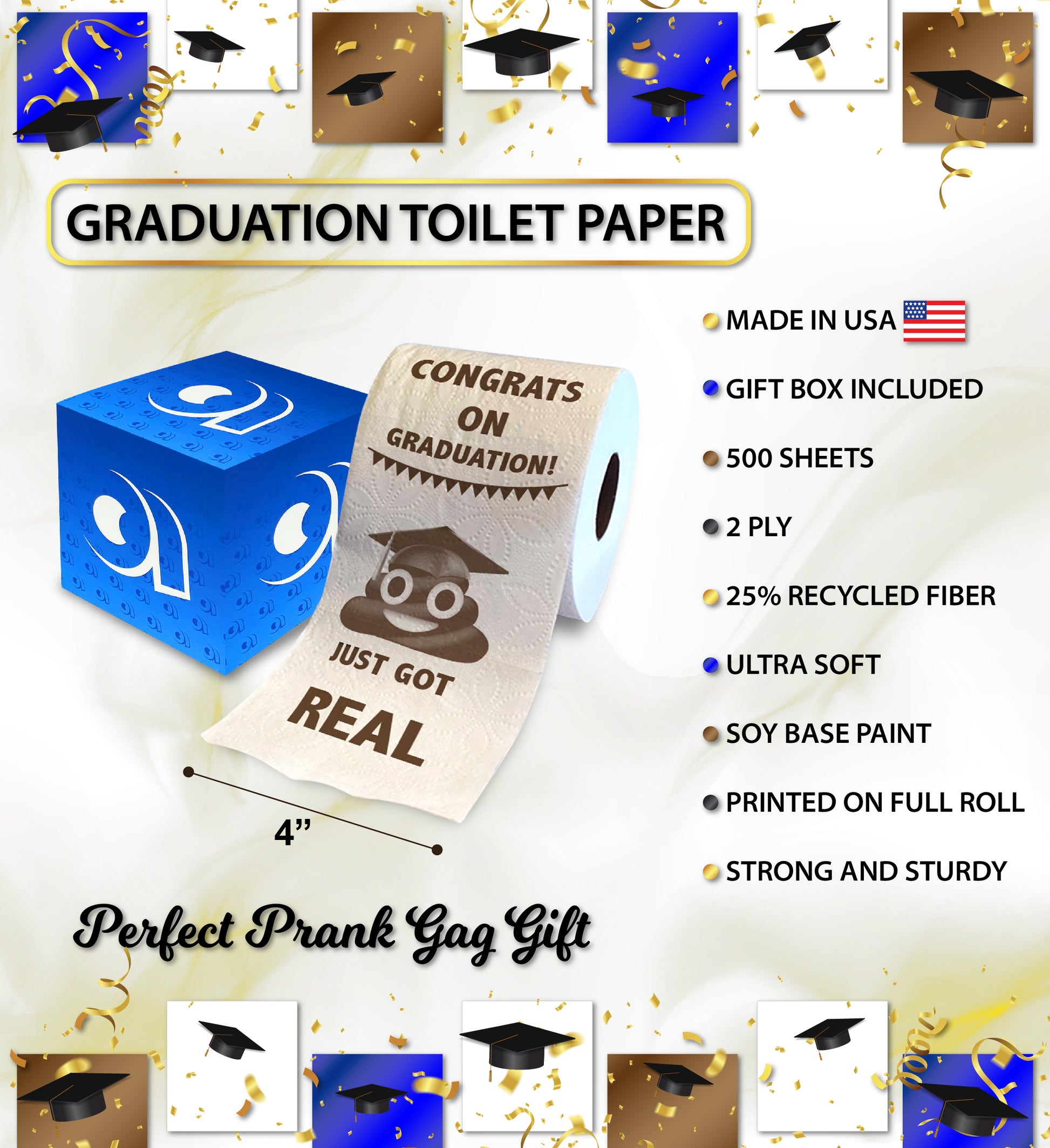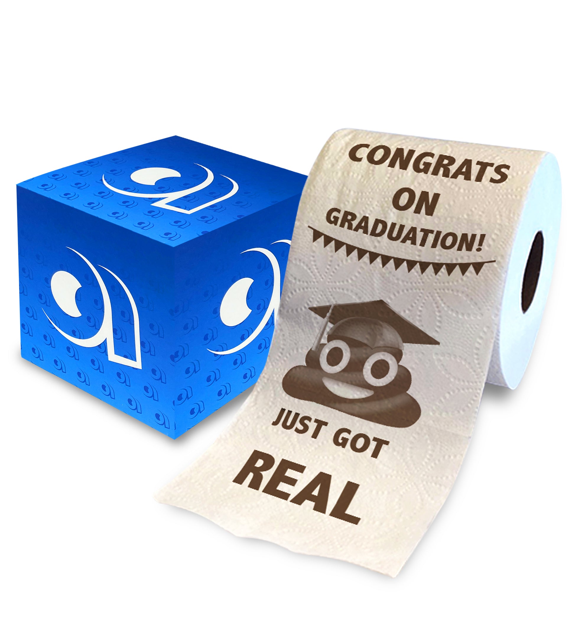 THE GRADUATION TOILET PAPER ROLL COMES WITH A UNIQUE DESIGN YOU LOVE - Entire roll is printed with a hilarious Congrats on Graduation Sh*t Just Got Real image design. The funniest grad present to create a funny surprise reaction for the graduate and all guests, will make your loved ones laugh and create a lasting memory! Comes ready in a gift box, created with quality rub-resistant soy ink and recycled materials. Size 4x4 inches.