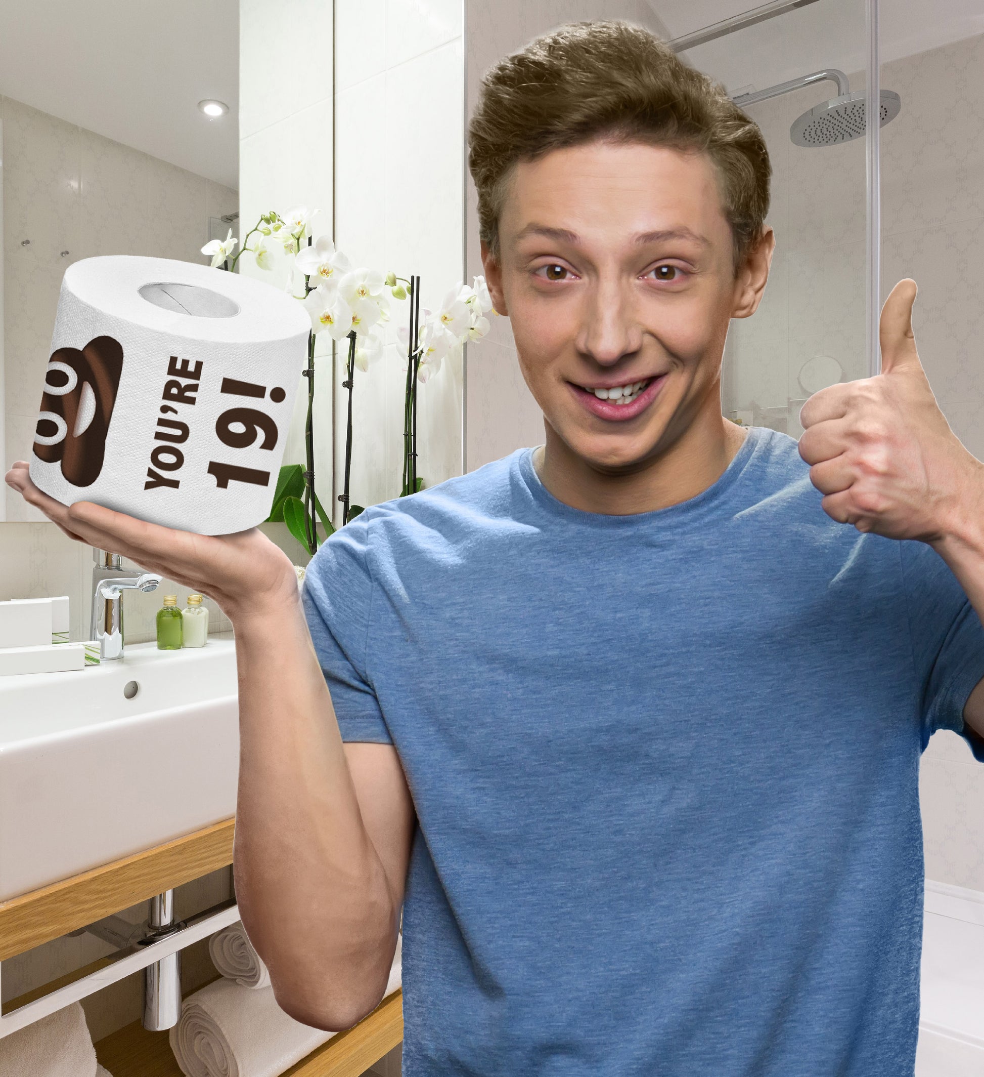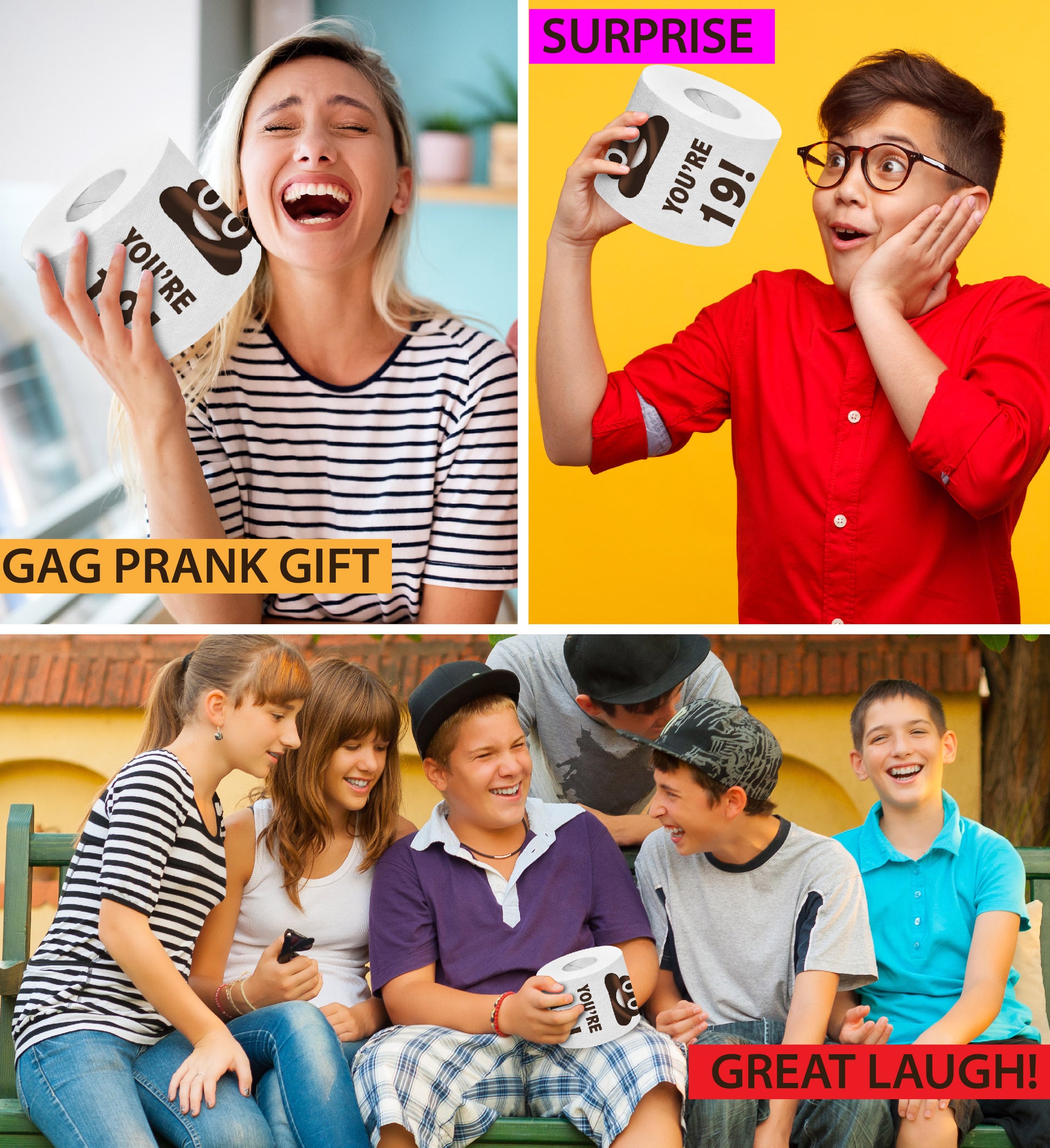 THE BIRTHDAY PAPER ROLL COMES WITH A UNIQUE DESIGN YOU LOVE – Entire roll is printed with a hilarious Holy Poop You're 19! design. Funny toilet paper gag gift for a 19th birthday will create a funny surprise reaction for the birthday teen and all guests. Prank toilet paper is a joke everyone will get a kick out of and lasting memory! Comes in a gift box ready to gift, created with quality rub-resistant soy ink and recycled materials.
