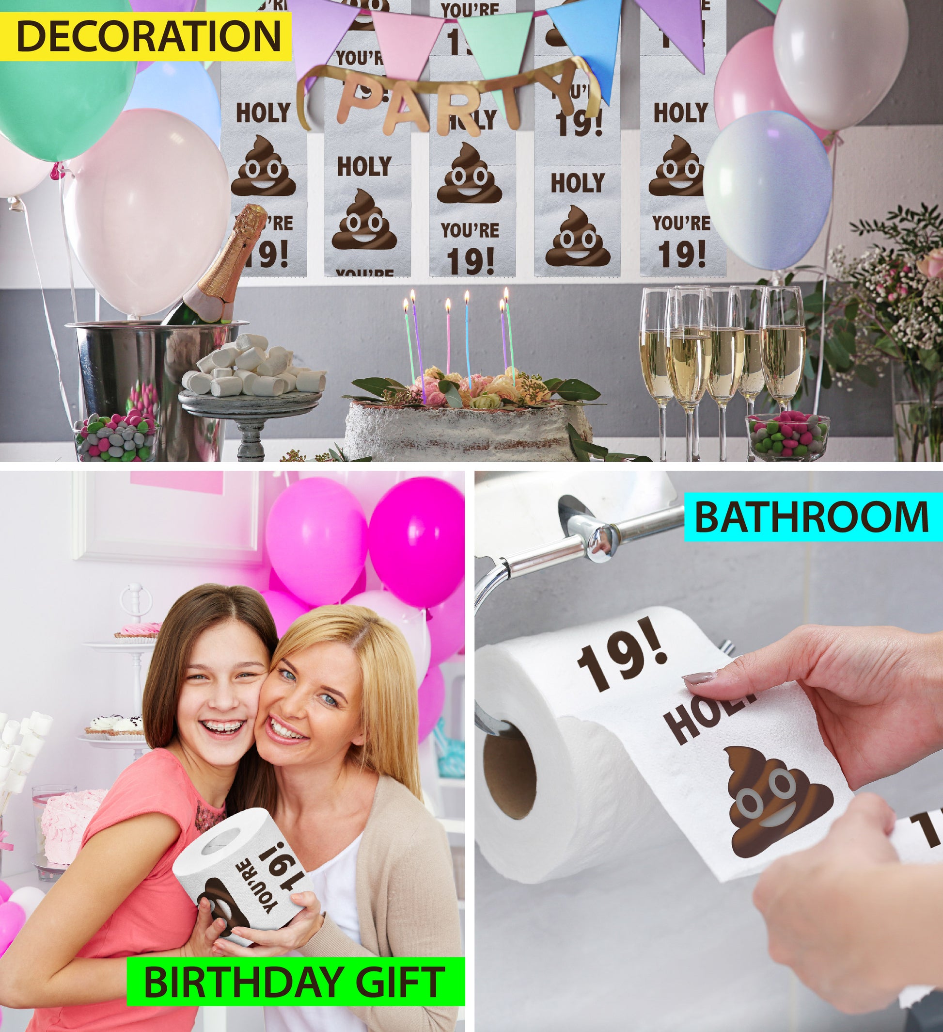 THE HOLY POOP NOVELTY TOILET PAPER IS FOR THOSE WHO LOVE PRANKS – The Happy 19th Birthday printed toilet paper is a funny joke toilet paper for a prankster to gift classmates, friends, siblings, and family turning 19 years old! Give away as funny birthday gag gifts, party prize, or office decor for 19th birthday celebrations. Add to the 19th birthday turners' restroom or use as a streamer to decorate their home, catch their funny reaction!